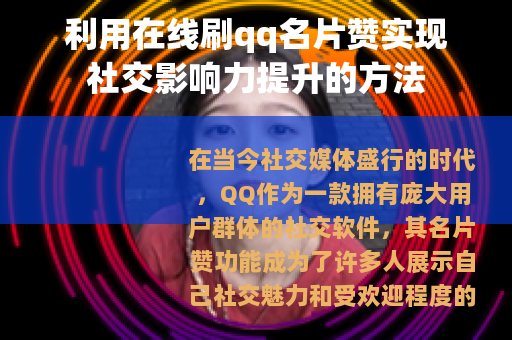 在当今社会,人们越来越注重自己在社交网络中的形象和影响力,QQ作为一款广泛使用的社交软件,其名片赞功能成为了用户展示自己受欢迎程度的重要方式之一,在线刷qq名片赞的出现,为用户提供了一种快速提升名片赞数量的途径,满足了用户在社交方面的需求。