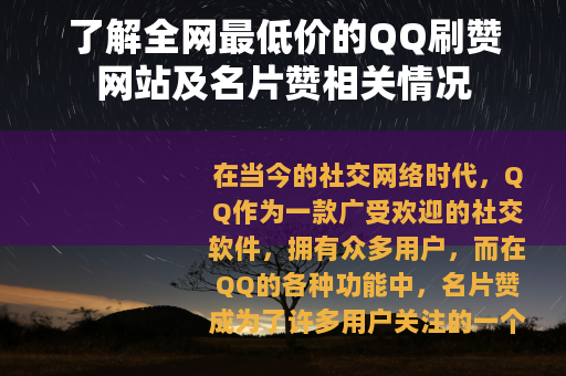在当今的社交网络时代,QQ作为一款广受欢迎的社交软件,拥有众多用户,而在QQ的各种功能中,名片赞成为了许多用户关注的一个点,为了满足用户对于名片赞数量的追求,市面上出现了众多的QQ刷赞网站,其中不乏声称全网最低价的平台。