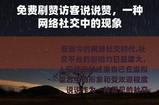 在当今的网络社交时代,社交平台的影响力日益增大,人们越来越注重自己在虚拟世界中的形象和受欢迎程度,说说作为一种常见的社交动态发布形式,其点赞数和访客量往往被视为衡量其受欢迎程度的重要指标,而免费刷赞访客说说赞的现象也随之悄然兴起。