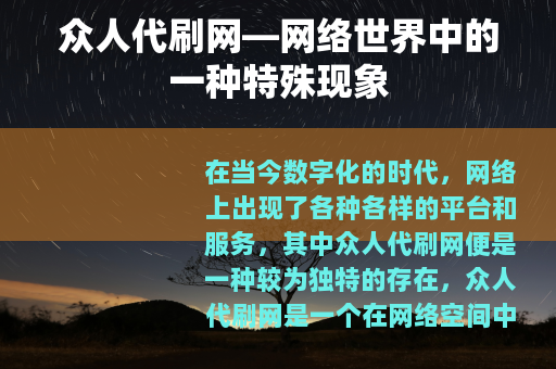 在当今数字化的时代,网络上出现了各种各样的平台和服务,其中众人代刷网便是一种较为独特的存在,众人代刷网是一个在网络空间中为用户提供各种代刷服务的平台,它涵盖了众多领域,从社交媒体的点赞、评论、粉丝数量增长,到视频平台的播放量、点赞量提升,再到各类网络投票活动的票数增加等等。