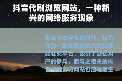 在当今数字化的时代,抖音作为一款极具影响力的短视频社交平台,吸引了数亿用户的参与,而与之相关的抖音代刷浏览网站也应运而生,成为了一个备受关注的话题。