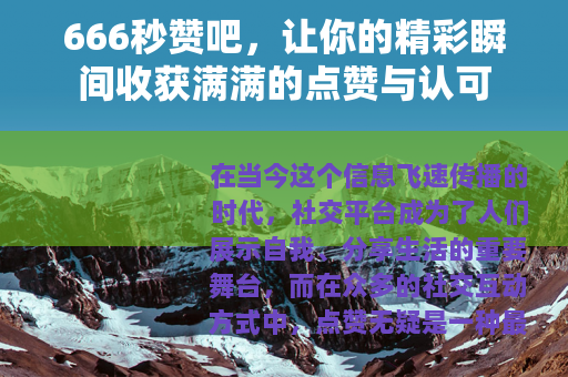 “666秒赞吧”的出现,为我们的社交生活增添了一抹亮丽的色彩,它就像是一个充满活力的社交广场,人们在这里汇聚,彼此分享着生活中的点滴美好,无论是一张精美的风景照片,一段有趣的视频,还是一句富有哲理的话语,都能在这里找到欣赏它们的观众,并迅速收获大量的点赞,这些点赞,不仅仅是一个简单的数字,更是一种鼓励和肯定,让发布者感受到自己的努力和付出得到了他人的认可,从而激发他们继续创作和分享的热情。