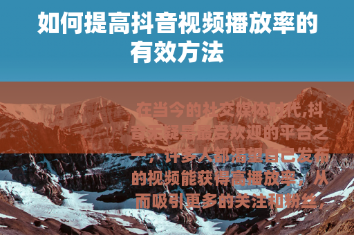 在当今的社交媒体时代,抖音无疑是最受欢迎的平台之一,许多人都渴望自己发布的视频能获得高播放率,从而吸引更多的关注和粉丝,究竟该如何提高抖音视频的播放率呢?以下是一些实用的方法。 是关键,要确保你的视频内容具有吸引力和独特性,可以从用户的兴趣点出发,了解当下热门的话题和趋势,将其融入到自己的视频创作中,如果你发现美食类视频很受欢迎,而你又擅长烹饪,那么就可以制作一系列精美的美食制作视频,展示独特的食谱和烹饪技巧,这样能更容易吸引到相关兴趣的用户。