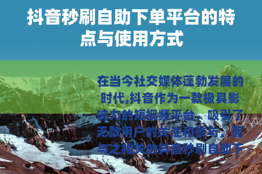 在当今社交媒体蓬勃发展的时代,抖音作为一款极具影响力的短视频平台,吸引了无数用户的关注和参与,而与之相关的抖音秒刷自助下单平台也逐渐进入了人们的视野。