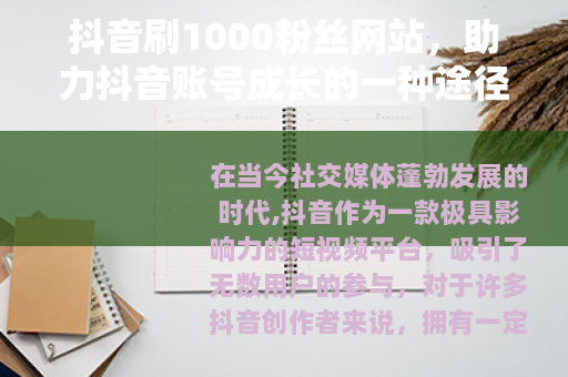 在当今社交媒体蓬勃发展的时代,抖音作为一款极具影响力的短视频平台,吸引了无数用户的参与,对于许多抖音创作者来说,拥有一定数量的粉丝是实现内容传播和个人价值的重要基础,而抖音刷1000粉丝网站的出现,为一些创作者提供了一种快速增加粉丝量的可能途径。