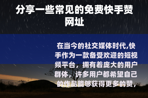 在当今的社交媒体时代,快手作为一款备受欢迎的短视频平台,拥有着庞大的用户群体,许多用户都希望自己的作品能够获得更多的赞,以增加曝光度和人气,而免费快手赞网址也因此受到了不少人的关注。