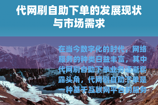 在当今数字化的时代,网络服务的种类日益丰富,其中代网刷自助下单业务逐渐崭露头角,代网刷自助下单是一种基于互联网平台的服务模式,它为用户提供了便捷的途径来实现各种网络数据的增长或任务的完成。