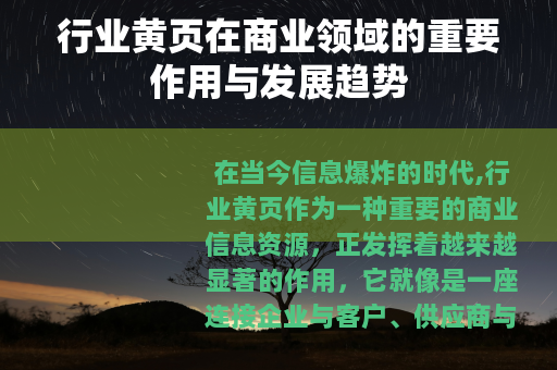 行业黄页作为一种重要的商业信息资源,在现代商业活动中发挥着不可或缺的作用,它为企业提供了市场营销的平台,为客户提供了便捷的采购渠道,促进了行业之间的交流与合作,随着科技的不断进步和市场的不断变化,行业黄页也在不断发展和创新,未来它将在商业领域中展现出更加广阔的发展前景,为经济的发展和社会的进步做出更大的贡献,无论是企业还是个人,都应该充分认识到行业黄页的价值,合理利用这一资源,实现自身的发展目标,在这个信息时代,行业黄页就像是一把开启商业成功之门的钥匙,等待着人们去发现和利用,它将继续在商业的舞台上扮演着重要的角色,助力企业腾飞,推动行业发展,为构建更加繁荣的商业世界贡献自己的力量。
