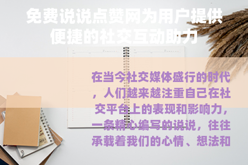 在社交生活中,免费说说点赞网已经成为了许多人不可或缺的一部分,它让我们的社交变得更加轻松、有趣和富有活力,我们可以在平台上分享生活中的点滴趣事,记录自己的成长历程,与朋友们一起分享快乐、分担烦恼,通过免费说说点赞网,我们的社交关系得到了进一步的巩固和拓展,让我们感受到了社交的魅力和温暖。