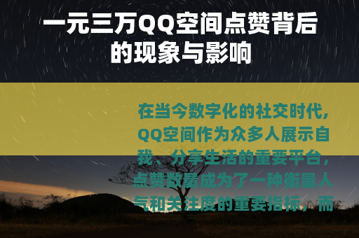 在当今数字化的社交时代,QQ空间作为众多人展示自我、分享生活的重要平台,点赞数量成为了一种衡量人气和关注度的重要指标,而市场上出现的一元三万QQ空间点赞的现象,引发了广泛的关注和讨论。