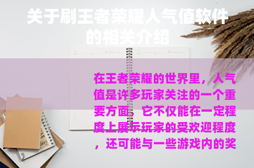 在王者荣耀的世界里,人气值是许多玩家关注的一个重要方面,它不仅能在一定程度上展示玩家的受欢迎程度,还可能与一些游戏内的奖励或荣誉相关联,刷王者荣耀人气值软件便应运而生,成为了不少玩家关注的焦点。