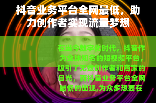 在当今数字化时代,抖音作为全球知名的短视频平台,吸引了无数创作者和商家的目光,而抖音业务平台全网最低的出现,为众多想要在抖音上崭露头角的人提供了一个极具性价比的选择。