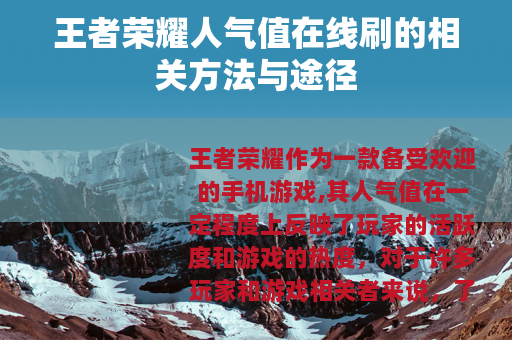 王者荣耀作为一款备受欢迎的手机游戏,其人气值在一定程度上反映了玩家的活跃度和游戏的热度,对于许多玩家和游戏相关者来说,了解如何提升王者荣耀的人气值是一个比较关注的话题。
