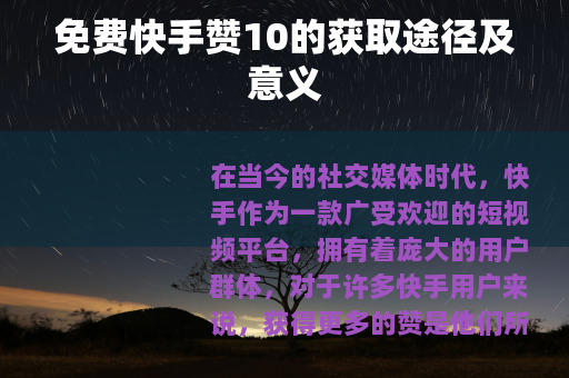 免费快手赞10虽然看似只是一个小小的数字,但它对于快手平台的用户和平台本身都有着重要的意义,无论是创作者还是观众,都可以通过积极的方式去获取和给予免费快手赞10,共同营造一个更加活跃、有趣、充满正能量的快手社区,在这个过程中,我们不仅能够享受到短视频带来的乐趣,还能结交更多志同道合的朋友,拓展自己的视野和社交圈子,让我们一起在快手的世界里,用赞传递温暖和力量,共同创造更多美好的回忆和精彩的瞬间。