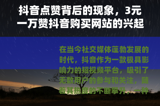 在当今社交媒体蓬勃发展的时代,抖音作为一款极具影响力的短视频平台,吸引了无数用户的参与和关注,随着其热度的不断攀升,一种与之相关的现象也逐渐崭露头角,那就是3元一万赞的抖音购买网站的出现。