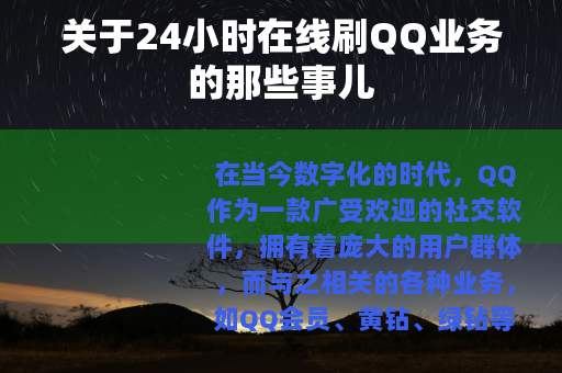 在当今数字化的时代,QQ作为一款广受欢迎的社交软件,拥有着庞大的用户群体,而与之相关的各种业务,如QQ会员、黄钻、绿钻等,也备受用户关注,24小时在线刷QQ业务的现象逐渐兴起,成为了不少人热议的话题。