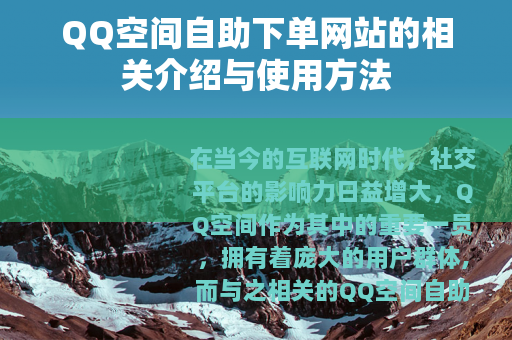 在当今的互联网时代,社交平台的影响力日益增大,QQ空间作为其中的重要一员,拥有着庞大的用户群体,而与之相关的QQ空间自助下单网站也逐渐走进了人们的视野。