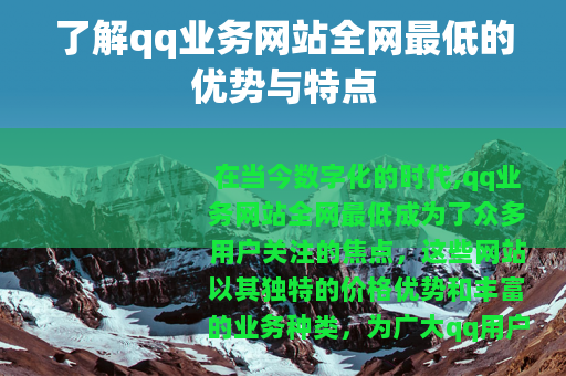 在当今数字化的时代,qq业务网站全网最低成为了众多用户关注的焦点,这些网站以其独特的价格优势和丰富的业务种类,为广大qq用户提供了更多的便利和选择。