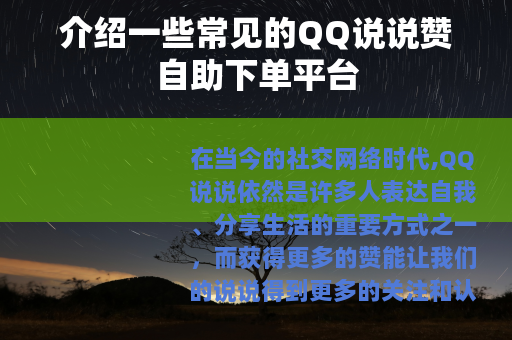 这些QQ说说赞自助下单平台为广大QQ用户提供了一种方便快捷的方式来增加说说的人气和关注度,用户可以根据自己的喜好和需求选择适合自己的平台,通过购买赞来让自己在QQ社交圈中更加活跃,让自己的心情和生活点滴能得到更多朋友的点赞和支持,在使用这些平台时,也要理性对待,不要过度依赖,毕竟真实的互动和有价值的内容才是社交网络的核心所在,希望大家都能在QQ说说的世界里,通过合理利用这些平台,收获更多的快乐和友谊,让自己的社交生活更加丰富多彩。