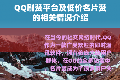 在当今的社交网络时代,QQ作为一款广受欢迎的即时通讯软件,拥有着庞大的用户群体,在QQ的众多功能中,名片赞成为了很多用户关注的一个方面,为了满足用户对于名片赞数量的追求,市场上出现了众多的QQ刷赞平台,其中低价名片赞的服务更是吸引了不少人的目光。