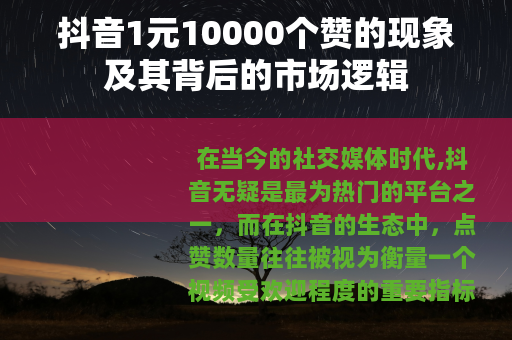 在当今的社交媒体时代,抖音无疑是最为热门的平台之一,而在抖音的生态中,点赞数量往往被视为衡量一个视频受欢迎程度的重要指标,一种奇特的现象出现了,那就是所谓的“抖音1元10000个赞”的服务在一些角落悄然兴起。