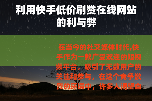 快手低价刷赞在线网站是一个在社交媒体发展过程中出现的现象,它既反映了用户对于快速获得关注和认可的需求,也凸显了平台在管理和发展过程中面临的挑战,我们需要在满足用户合理需求的同时,维护平台的公平和健康,让快手这样的社交平台能够更好地服务于用户,为社会创造更多的价值和文化财富,通过各方的共同努力,我们可以在追求热度和真实价值之间找到一个平衡点,实现快手平台以及整个短视频行业的可持续发展。