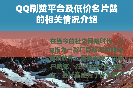在当今的社交网络时代,QQ作为一款广受欢迎的即时通讯软件,拥有着庞大的用户群体,在QQ的众多功能中,名片赞成为了许多用户关注的一个方面,为了满足用户对于名片赞数量的需求,市场上出现了各种各样的QQ刷赞平台,其中低价名片赞更是吸引了不少人的目光。