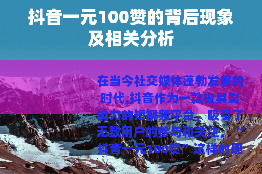 在当今社交媒体蓬勃发展的时代,抖音作为一款极具影响力的短视频平台,吸引了无数用户的参与和关注。“抖音一元100赞”这样的现象逐渐进入了大众的视野,引发了诸多讨论和思考。
