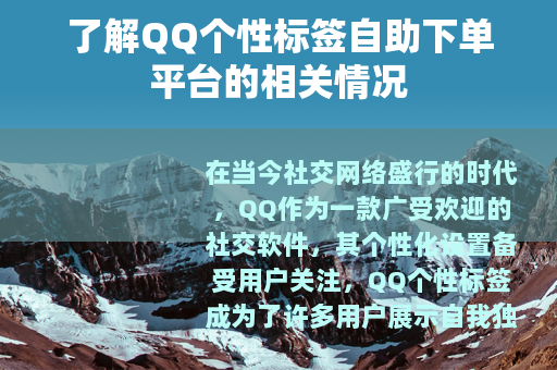 在当今社交网络盛行的时代,QQ作为一款广受欢迎的社交软件,其个性化设置备受用户关注,QQ个性标签成为了许多用户展示自我独特风格和个性的重要方式,而随着需求的增长,QQ个性标签自助下单平台也应运而生。