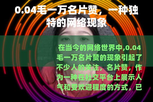 0.04毛一万名片赞是网络时代的一个特殊产物,它为我们提供了一种新的思路和方法,但也需要我们在实践中不断地摸索和总结经验,以使其更好地服务于我们的网络社交和发展需求。