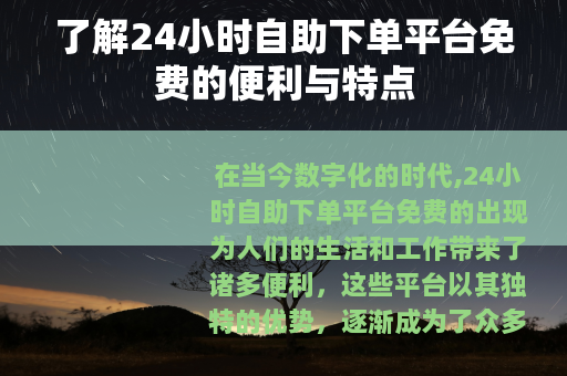 在当今数字化的时代,24小时自助下单平台免费的出现为人们的生活和工作带来了诸多便利,这些平台以其独特的优势,逐渐成为了众多用户的首选。