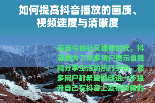 在当今的社交媒体时代,抖音成为了众多用户展示自我和分享生活的热门平台,很多用户都希望能够进一步提升自己在抖音上发布视频的画质、视频速度以及清晰度,以吸引更多的观众和获得更好的传播效果,以下是一些实用的方法,可以帮助你实现这一目标。