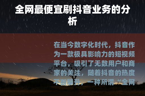 在当今数字化时代,抖音作为一款极具影响力的短视频平台,吸引了无数用户和商家的关注,随着抖音的热度不断攀升,一种所谓“全网最便宜刷抖音业务”的现象也逐渐出现在大众视野中。