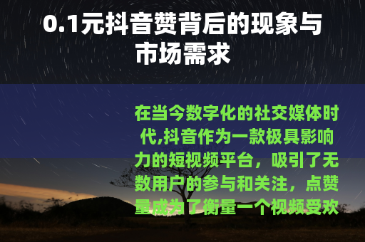 在当今数字化的社交媒体时代,抖音作为一款极具影响力的短视频平台,吸引了无数用户的参与和关注,点赞量成为了衡量一个视频受欢迎程度的重要指标之一,而0.1元抖音赞这一现象也随之悄然兴起,在网络世界中引发了一系列的讨论和关注。