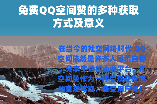 在当今的社交网络时代,QQ空间依然是许多人展示自我、分享生活的重要平台,而空间赞作为一种受欢迎程度的直观体现,备受用户关注,免费QQ空间赞更是成为了不少人追求的目标。