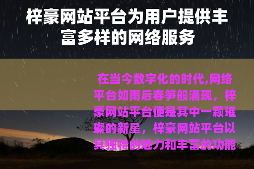 在当今数字化的时代,网络平台如雨后春笋般涌现,梓豪网站平台便是其中一颗璀璨的新星,梓豪网站平台以其独特的魅力和丰富的功能,吸引了众多用户的关注和喜爱。