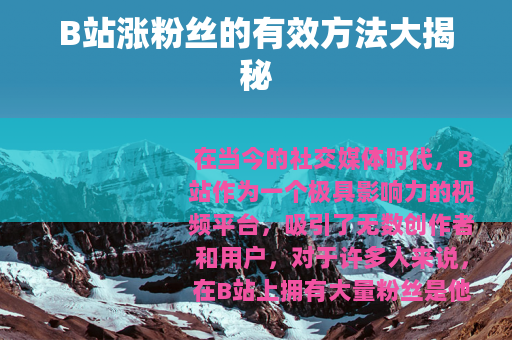 在当今的社交媒体时代,B站作为一个极具影响力的视频平台,吸引了无数创作者和用户,对于许多人来说,在B站上拥有大量粉丝是他们的梦想之一,因为这不仅意味着自己的作品得到了更多人的认可,还能带来更多的机会和收益,如何在B站上实现粉丝的增长呢?以下是一些实用的方法。 质量是关键,要制作出高质量、有吸引力的视频内容,这需要你深入了解自己的目标受众,明确他们的兴趣和需求,如果你面向的是年轻的游戏爱好者,那么制作精彩的游戏攻略、搞笑的游戏实况等视频就会更受他们欢迎,在视频制作过程中,要注重画面的清晰度、剪辑的流畅性以及音频的质量,给观众带来良好的视听体验。