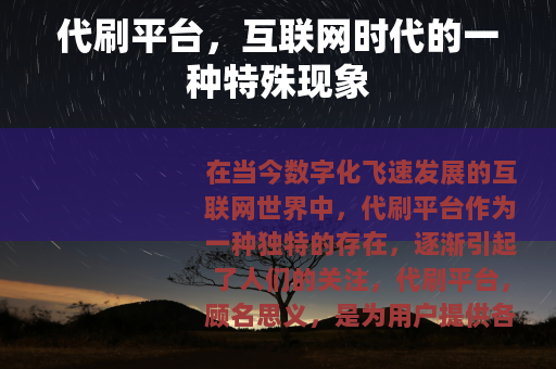 代刷平台是互联网时代的一个特殊产物,它既满足了一部分用户的需求,又带来了一系列的挑战和问题,在未来的发展中,我们需要在鼓励创新和竞争的同时,加强对代刷平台等类似现象的引导和规范,以维护一个健康、公平、有序的互联网环境,让数据真正成为衡量价值和推动发展的有力工具,而不是被虚假的数据所蒙蔽,我们才能在互联网的浪潮中实现可持续的发展,让每一个努力和创造都能得到应有的回报。