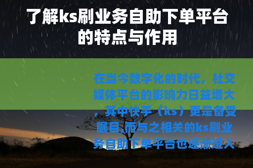 在当今数字化的时代,社交媒体平台的影响力日益增大,其中快手(ks)更是备受瞩目,而与之相关的ks刷业务自助下单平台也逐渐进入了人们的视野。