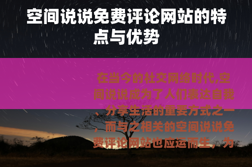无论是对于普通用户还是对于那些希望在社交网络中有所作为的人来说,空间说说免费评论网站都具有很大的价值和意义,它让人们的社交生活更加丰富多彩,让人们的思想和情感能够在更广阔的空间中得到交流和碰撞,让我们一起期待空间说说免费评论网站在未来能够带给我们更多的惊喜和感动,让我们的社交之旅更加精彩和难忘。 对您有所帮助,您可以根据实际需求进行调整和修改,如果您还有其他问题,欢迎继续向我提问。