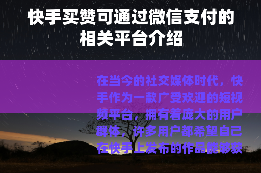 在当今的社交媒体时代,快手作为一款广受欢迎的短视频平台,拥有着庞大的用户群体,许多用户都希望自己在快手上发布的作品能够获得更多的点赞,从而提高作品的曝光度和影响力,而随着需求的增长,一些提供快手买赞服务的平台应运而生,其中部分平台支持微信支付这种便捷的支付方式。
