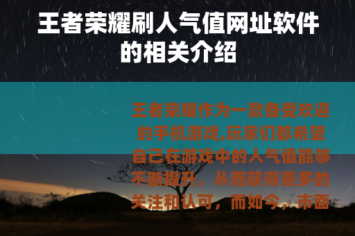 王者荣耀刷人气值网址软件虽然看似能够满足玩家快速提升人气值的需求,但其中隐藏着诸多风险和问题,玩家们应该理性对待,不要盲目追求虚假的人气,而是通过自身的努力和合法合规的方式在游戏中获得真正的认可和人气,才能在王者荣耀的世界里享受到健康、快乐的游戏体验。