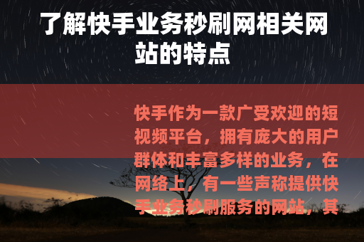 快手作为一款广受欢迎的短视频平台,拥有庞大的用户群体和丰富多样的业务,在网络上,有一些声称提供快手业务秒刷服务的网站,其中有一些网站号称价格最便宜,吸引了不少人的关注。