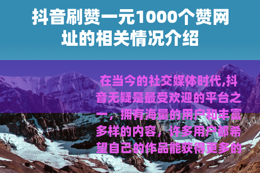 在当今的社交媒体时代,抖音无疑是最受欢迎的平台之一,拥有海量的用户和丰富多样的内容,许多用户都希望自己的作品能获得更多的点赞,以增加曝光度和影响力,一些声称能提供抖音刷赞服务的一元1000个赞网址便应运而生。