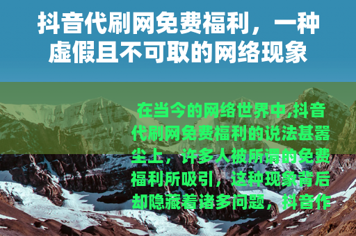 在当今的网络世界中,抖音代刷网免费福利的说法甚嚣尘上,许多人被所谓的免费福利所吸引,这种现象背后却隐藏着诸多问题。