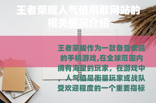 王者荣耀作为一款备受欢迎的手机游戏,在全球范围内拥有海量的玩家,在游戏中,人气值是衡量玩家或战队受欢迎程度的一个重要指标,随着游戏的发展,一些所谓的王者荣耀人气值刷取网站也应运而生。