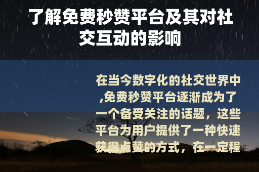 在当今数字化的社交世界中,免费秒赞平台逐渐成为了一个备受关注的话题,这些平台为用户提供了一种快速获得点赞的方式,在一定程度上满足了人们对于社交认可和关注度的需求。