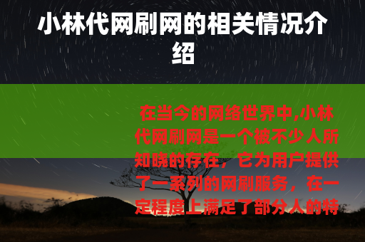 在当今的网络世界中,小林代网刷网是一个被不少人所知晓的存在,它为用户提供了一系列的网刷服务,在一定程度上满足了部分人的特定需求。