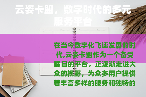 云姿卡盟以其独特的优势和不断创新的精神,在数字产品交易市场中崭露头角,为广大用户带来了诸多便利和价值,它的出现,不仅丰富了人们的数字生活,也推动了数字经济的发展和创新,相信在未来的日子里,云姿卡盟将继续书写属于自己的辉煌篇章,为数字世界增添更多的精彩。