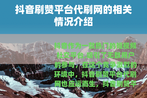 抖音刷赞平台代刷网在当今社交媒体的大背景下,已经成为了一个不可忽视的现象,它的存在既反映了用户对于社交媒体影响力的追求,也凸显了平台在管理和规范方面所面临的挑战,随着技术的不断发展和社会观念的变化,抖音刷赞平台代刷网未来的走向也充满了变数。